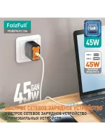 CЗУ Блок в коробке FC186 USB-C 45W USB-A 18W GaN , Super Fast Charge 2.0 от FaizFull – это компактный и мощный адаптер, который станет незаменимым помощником для всех, кто ценит скорость и удобство зарядки. Он оснащен двумя портами: USB-C с поддержкой быстрой зарядки Super Fast Charge 2.0 мощностью 45 Вт и USB-A мощностью 18 Вт. Благодаря технологии GaN, блок отличается высокой эффективностью и компактными размерами, что делает его идеальным для путешествий и поездок. Заряжайте свой смартфон, планшет или ноутбук с максимальной скоростью, не беспокоясь о громоздких зарядных устройствах. мощность PD 45W + QC 3.0 1 выход питания USB -18w 1 выход питания Type-C - 45w Подходит для: Телефона ,планшета,power bank, блютуз колонок
