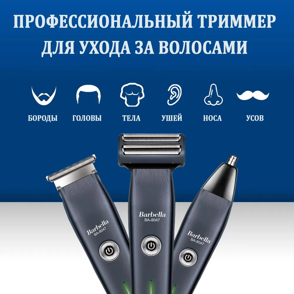 Триммер 3в1 - это универсальное устройство для мужчин, которое позволяет легко и безопасно поддерживать ухоженный вид лица и тела. Благодаря качественным лезвиям и эргономичному корпусу, этот прибор подходит для бритья, бороды, усов, бровей, удаления волос в носу и ушах, а также для интимной зоны, бикини. Он оснащен 3-мя насадками, позволяющими регулировать длину стрижки и создавать разные стильные образы. Насадка для носа и ушей помогает легко удалять волосы в труднодоступных местах. Время полной зарядки триммера составляет 2 часа, около 120 минут работы. Профессиональная бесшумная электробритва будет хорошим подарком парню, мужу, брату, которые ценят красоту, здоровье и качество. Триммер с аккумулятором предполагает беспроводное использование и удобство в любых условиях: дома, в парикмахерской, и в дороге. Удобен в переноске, заряжается с помощью кабеля USB - TYPE C, имеет мощный долговечный роторный двигатель с высокой производительностью и точностью работы. Защита лезвий и ручка обеспечивают безопасность, а компактный черный корпус делает бритву стильной. Ручная аккумуляторная машинка предназначена для укладки, подравнивания бакенбард, коррекции секущихся кончиков, стрижки ребенка, избавления от ненужных волос любого размера и толщины. Лезвия из нержавеющей стали предотвращают порезы, гарантируют гладкое бритье без раздражения кожи.