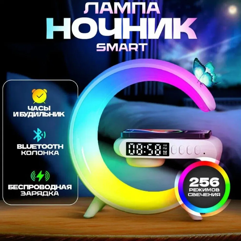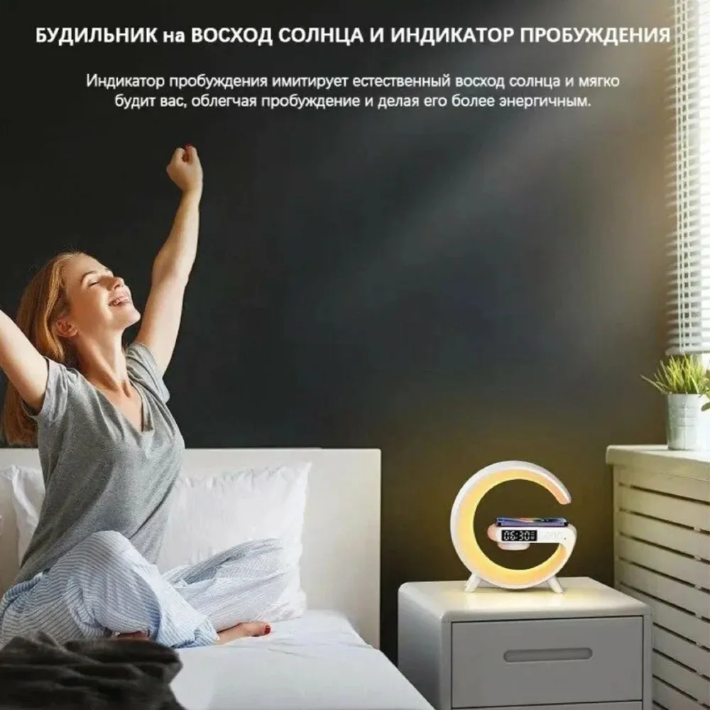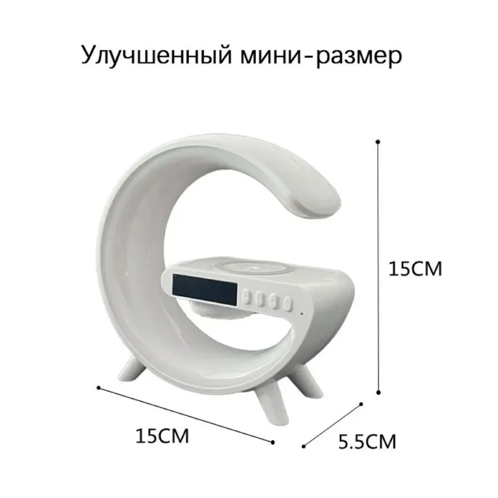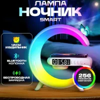 Многофункциональная беспроводная лампа совмещает в себе функции зарядного устройства (для телефона и наушников, без смарт часов) , bluetooth-колонку, ночник. Встроенная настольная светодиодная лампа имеет 256 режимов и 16 миллионов цветов подсветки, которые удобно переключать. Демпируемая bluetooth лампа имеет эффект рассвета, свет пробуждения имитации восход солнца. Зарядное устройство для телефона совместимо со всеми устройствами iOS и Android. Современный и элегантный дизайн смарт лампы впишется в любой интерьер и станет его дополнением. Дополнительно настольная лампа оснащена функцией воспроизведения музыки, а также можно использовать умную звуковую лампу как динамик. Управление функциями смарт лампы реализовано. Во время пробуждения можно настроить имитацию рассвета. Настольная лампа G-Smart Light – это современный прибор, который будет не только освещать комнату, выступая в качестве ночника, но и имеет беспроводную зарядку и стильный неповторимый дизайн. 12 цветов создадут идеальное настроение для любой комнаты. Колонка оснащена зарядной станцией для управления - вы можете управлять различными функциями через неё, например хотите ли вы просыпаться под лампу, напоминающую восход солнца, или даже все цвета радуги в одной цветовой схеме. Вы также можете настроить лампу, воспроизводя собственные аудиоклипы и песни. Лампа имеет уникальные функции, которые редко встречаются в обычных настольных лампах. Вы можете подключать лампу через Bluetooth к своему телефону и включать «белый шум», который будет хорошо влиять на вашу способность уснуть и качество сна. Разноцветная подсветка. В лампе есть 256 режимов ночного освещения! Настройка света. С его помощью вы сможете подобрать тот цвет освещения, который будет больше всего вам по душе. В светодиодной лампе есть встроенные динамики, которые выводят объемный звук на 360 градусов. Подключение производится между устройствами по Bluetooth. Включив музыку на телефоне, она будет воспроизводиться лампой. Свет может изменяться в ритме музыки - высокие яркие и прозрачные частоты, средние частоты четкие и динамические, бас глубокий с чувством громкости.