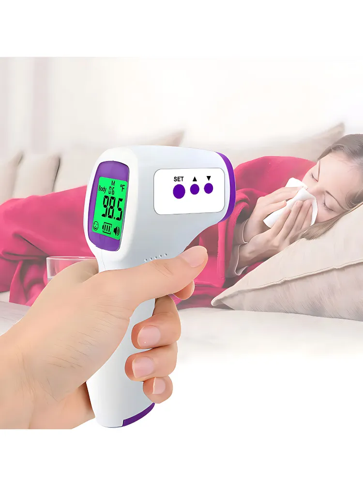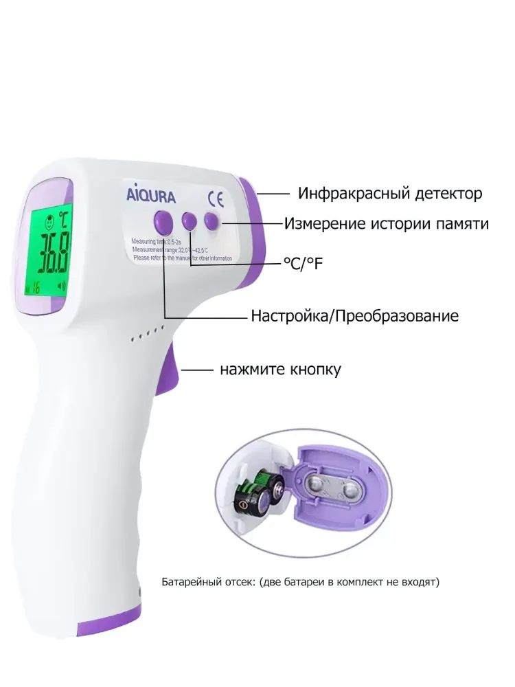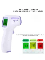 Медицинский бесконтактный термометр для измерения температуры тела детей и взрослых. Измерение температуры происходит примерно за 1 секунду. Погрешность измерения составляет всего 0.2 градусов. Измерение температуры производится на расстоянии от 3 до 5 сантиметров. Устройство оснащено встроенной памятью, в которой сохраняются результаты последних 16 измерений. Изменяемая подсветка дисплея наглядно продемонстрирует отклонение температуры от нормальной. Автоматическое отключение термометра после 15 секунд без использования.