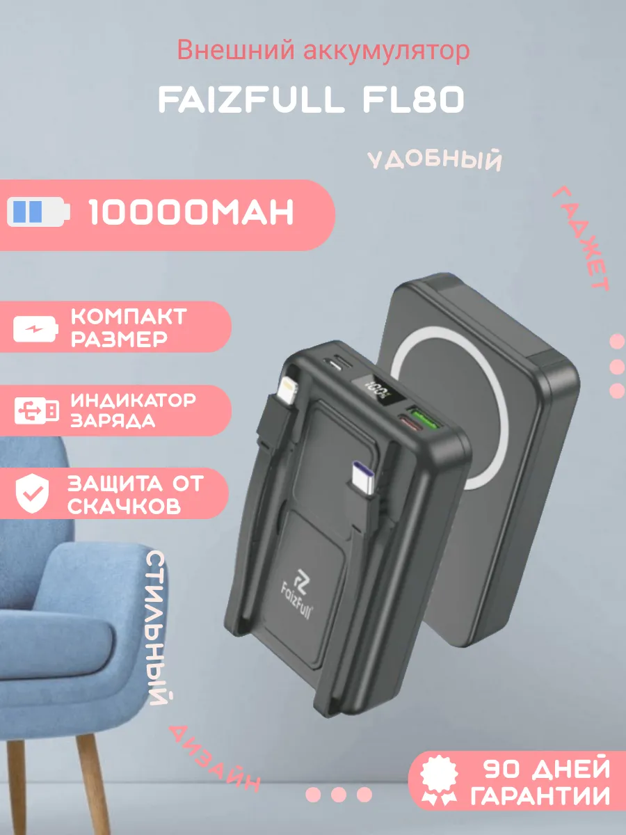 Портативное зарядное устройство PowerBank FaizFull FL80 QC3.0 22.5W на 10000 mAh с проводной и беспроводной зарядкой (магнитное крепление).