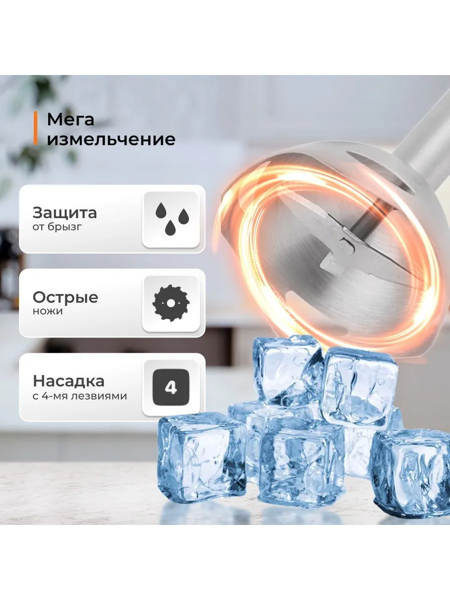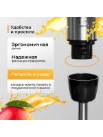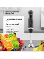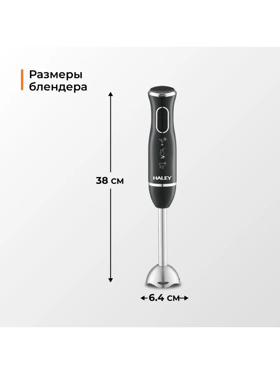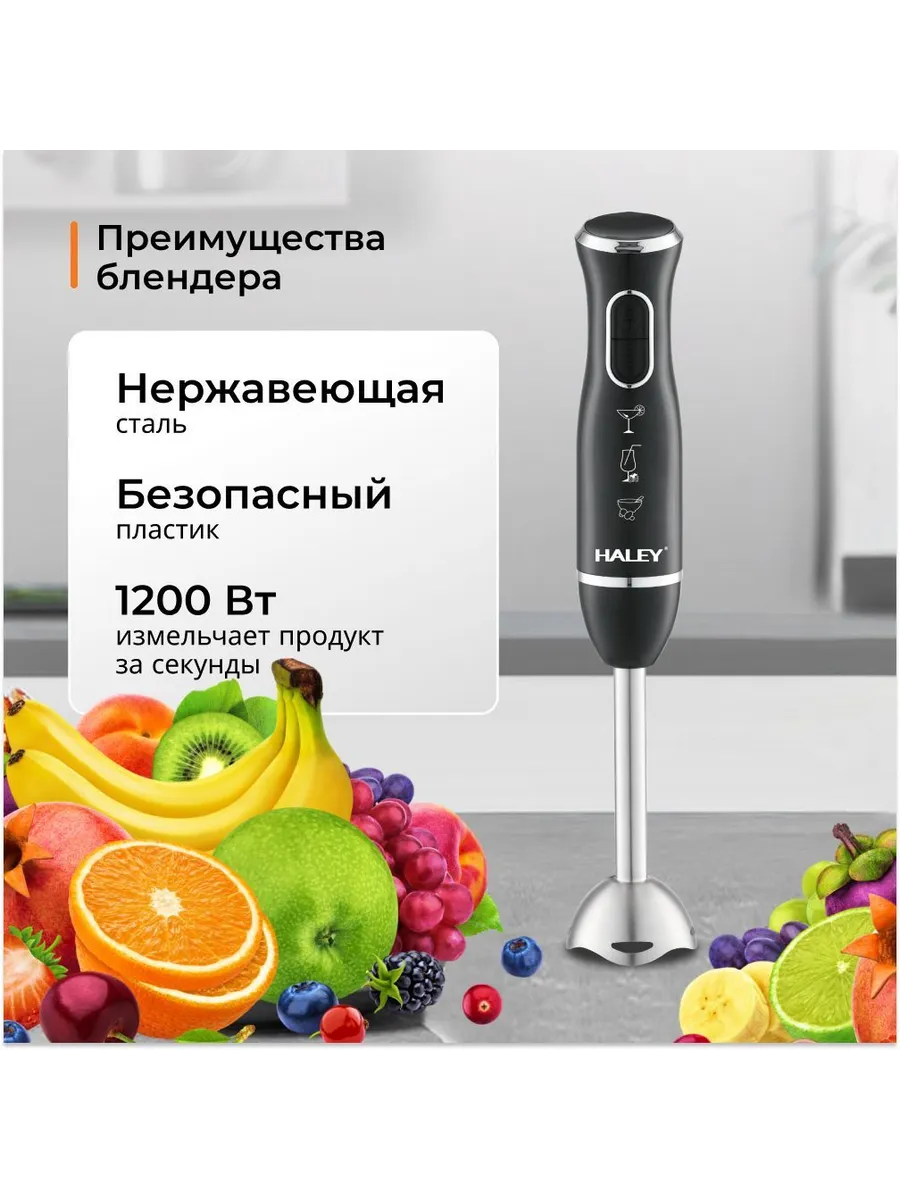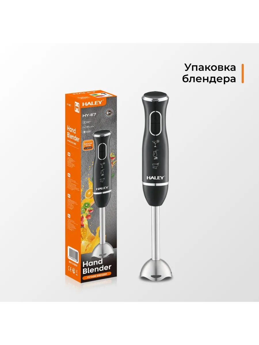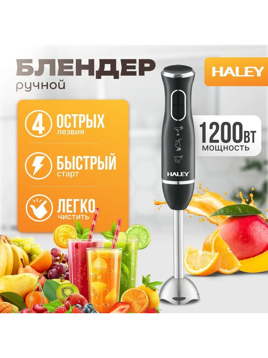 Мощный погружной блендер HALEY с мощностью 1200 Вт и 4 острыми лезвиями легко справляется со смешиванием, измельчением, приготовлением фарша и твердых фруктов для смузи, супов, молочных коктейлей и теста. Эргономичный дизайн и прочные материалы обеспечивают удобство использования и долговечность. Блендер оснащен LED индикатором работы, плавной регулировкой скорости (2 скорости) и режимом TURBO для увеличения мощности. Съемная основа и лезвия из нержавеющей стали SUS304 облегчают чистку. Конструкция для предотвращения разбрызгивания. Подходит для любого типа контейнеров. Питание от сети 220-240 В 50/60 Гц.